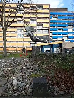 - ↑ Goudgekleurde, kunststoffen vormen (schelpen, zwammen, hoogovenslakken) aan de slootkant en in lantaarnpalen in de wijk. Ongeveer 10 objecten