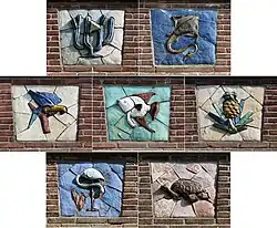 | 195? | Tableaus met tropische voorstellingen (7 exemplaren) | Anno Smith | Surinamestraat 1-167 | Groningen | geglazuurd terracotta |
