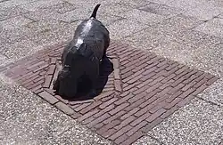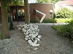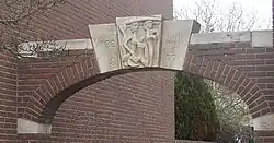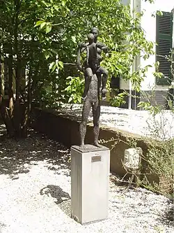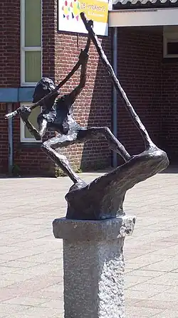 - ↑ Het kunstwerk van kalksteen was oorspronkelijk geplaatst op het schoolplein van de Hoffenneschool. Na sloop van dit gebouw in 1991 is het kunstwerk bij het gemeentehuis geplaatst.