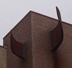- ↑ Plastiek aan zijgevel flatgebouw Haesduinen, aangebracht ter gelegenheid van de oplevering van de 500e woning van Woningbouwvereniging Noordwijk. De vorm van het beeld is gebaseerd op de vleugel van Icarus en de boeg van een schip.