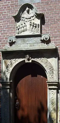 Het losse kopje (frontonsteen) boven de deur is een versiering uit de Renaissance (17e eeuw). Dit kunstwerk is eigendom van de gemeente. |