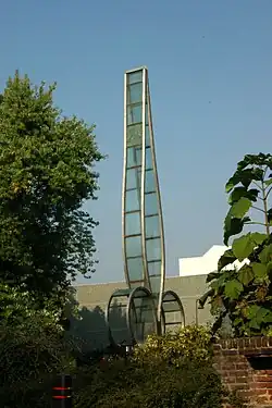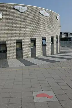 - ↑ In de verbinding tussen twee bestaande gebouwen heeft architect Wouter Eykelenboom in samenwerking met Hanshan Roebers en Marijke De Goey een ranke constructie van staal en glas opgetrokken. De bijdragen van Roebers en de Goey bestaat uit het kleurengamma dat ontstaat door de richting die het licht heeft ten opzichte van de glasplaten. Het natuurlijke licht vermengt zich met de kleine vierkanten en gebogen rechthoeken in blauw neon die aan diverse punten zijn aangebracht.