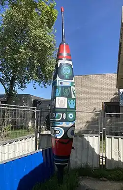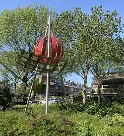 - ↑ Kleurrijke blikvanger, in de volksmond "De Dobber" (1970, gerestaureerd 2003) geplaatst bij de opening van het Walderveenbad, gemaakt door Pieter C.J. van Velzen geb. 1911 te Weesp - overleden 1990 te Loosdrecht; beeldhouwer, kunstschilder en glazenier, werkte en woonde o.a. aan de Nw. Loosdrechtsedijk 88