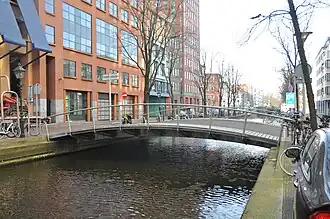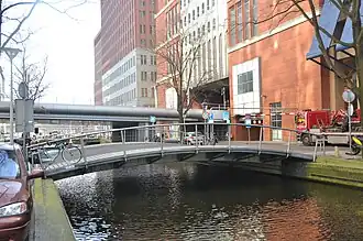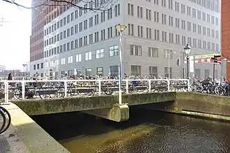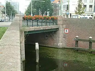 Vaste brug tussen Oranje buitensingel en Zwarte weg met een wijdte van 10,95 m en een doorvaarthoogte van ongeveer KP +1,25 m. Nabij de brug is tramviaduct naar het Centraal Station. Op de rechterfoto is een Randstadrail-tram te zien op dat viaduct.