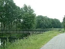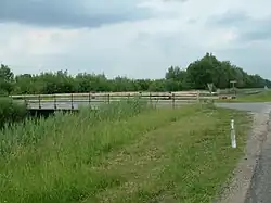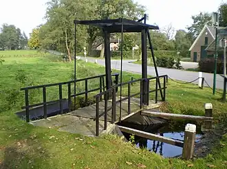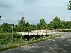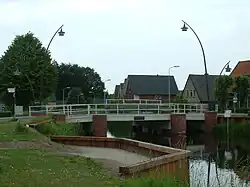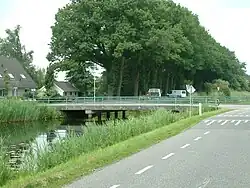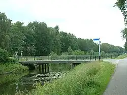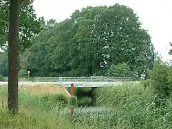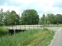 | Maatbrug (’t Jeroen Schut Bruggetje) | 't Jeroen Schut Bruggetje is niet de officiële naam. Op 6 november 2000 is Jeroen Schut – op dat moment 12 jaar - op zijn fiets op de onbewaakte overweg bij de brug aangereden door een locomotief van Railion en aan het einde van de middag in het ziekenhuis overleden. Het naambordje aan beide zijden van de brug kwam er via de burgemeester na een gesprek met de ouders.[3] ![]() | |