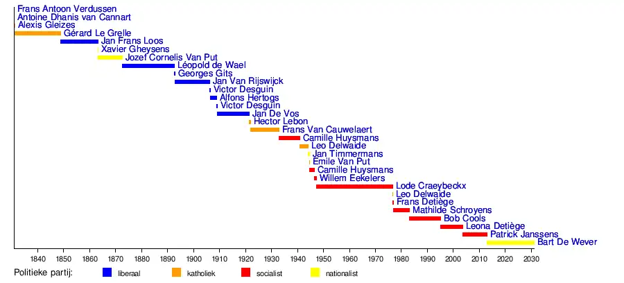 De eerste jaren van de Belgische onafhankelijkheid had Antwerpen katholiek-unionistische burgemeesters. Van 1848 tot 1921 waren de burgemeesters liberalen (met uitzondering van het Meeting-intermezzo tussen 1863 en 1872). Tussen 1921 en 1932 had de stad een katholieke burgemeester, met Frans Van Cauwelaert. De benoemde burgemeesters van de stad zijn van 1932 tot 2012 allen van socialistische signatuur: Camille Huysmans, Lode Craeybeckx, Frans Detiège en Mathilde Schroyens, en na de fusie Bob Cools, Leona Detiège en Patrick Janssens. Vanaf 2013 zijn dit de Vlaams-nationalisten Bart De Wever en Els van Doesburg.