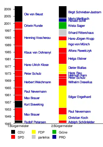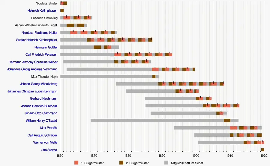 Volgens de grondwet van de vrije hanzestadHamburg van 28 september1860 wordt de stadstaat bestuurd door een 10 leden tellende Senat (Senaat), voor die tijd Rath (Raad)[1] genaamd. De Senat wordt geleid door een Erster Bürgermeister (Eerste Burgemeester) als Präsident des Senats (President van de Senaat), bijgestaan door een Zweiter Bürgermeister (Tweede Burgemeester). Tot 1997 was de Erste Bürgermeisterprimus inter pares, eerste onder de gelijken, aangewezen door zijn collega's in de Senat. Sinds 1997 wordt de Erste Bürgermeister gekozen door de Hamburger Bürgerschaft, het parlement van de stadstaat. De bevoegdheden van de Erste Bürgermeister zijn sindsdien uitgebreid, zo kan hij bijvoorbeeld senatoren ontslaan.