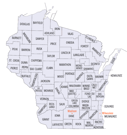 De Amerikaanse staat Wisconsin is onderverdeeld in 72 county's: