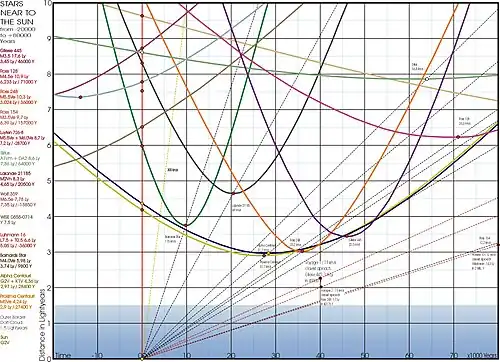 | Naam | Kleinste afstand in lichtjaren | Passagedatum in jaren | Huidige afstand in lichtjaren | Spectraalklasse | Massa in M☉ | Huidige schijnbare magnitude | Rechte klimming | Declinatie |