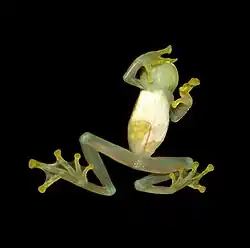 Glaskikkers danken de naam aan de enigszins doorzichtige huid, vooral op de buik, waardoor bij veel soorten de inwendige organen te zien zijn. Bij sommige soorten zelfs het hart, dat echter vaak aan het oog onttrokken wordt door een wit vlies eromheen dat dient ter bescherming. |