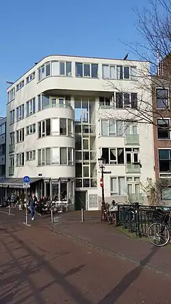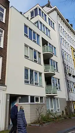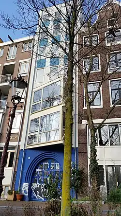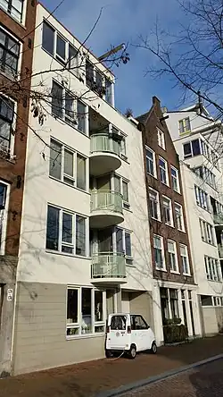 geen | Nieuwbouw uit periode 1982/1985 naar ontwerp van Paul de Ley en Fenna Oorthuys. Een combinatie van ronde gebouwvormen en raamstroken, dat terugvoert op de Amsterdamse Schoolstijl; glasoppervlakten zijn echter groter. Maakt deel uit van meerdere nieuwbouwpanden aan de gracht van De Ley, die hier gaten in de 19e-eeuwse bebouwing moest opvullen binnen de sociale woningbouw. Ten opzichte van de omgeving valt bovendien het pastelkleurige pleisterwerk op. Nummer 24 uit de brochure Post '65 Architectuur 1966-1990 in Amsterdam van Erfgoedvereniging Heemschut (2019)[5][6] |
