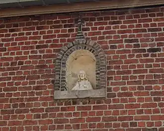 In een ingebouwde afgesloten rondboognis bevindt zich een Onze-Lieve-Vrouwbeeld met kind op de linkerarm. De nis is gedragen door een dorpel in blauwe hardsteen.[11]