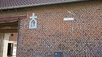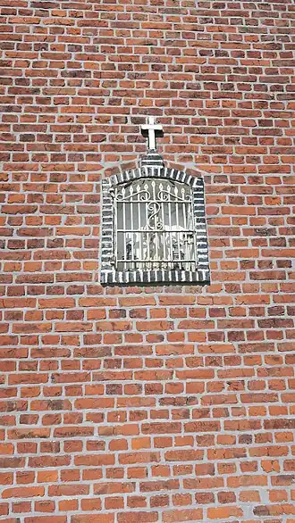 De gevelniskapel met topkruis en omlijsting is volledig witgeschilderd. In de nis hangt een metalen Christuskruis.[9]