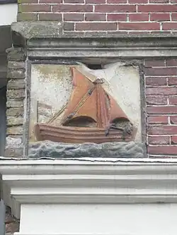 | Straatvaarder, als verwijzing naar de handel tussen Hoorn en de Middellandse Zee en de Levant. Het afgebeelde schip is een galjoen en stamt uit de eerste helft van de 17e eeuw. | onbekend | Muntstraat 26 | Hoorn | |||