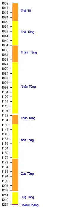 | Lý Nhân Tông | Thái Ninh (1072-1076) Anh Vũ Chiêu Thắng (1076-1084) Quảng Hựu (1085-1092) Hội Phong (1092-1100) Long Phù (1101-1109) Hội Tường Đại Khánh (1110-1119) Thiên Phù Duệ Vũ (1120-1126) Thiên Phù Khánh Thọ (1127-1127) |