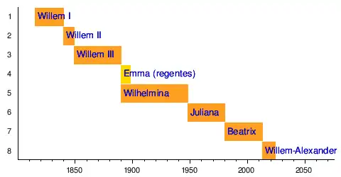 | Was de enige dochter van Willem III en Emma. Toen haar vader in 1890 overleed was zij nog maar tien jaar jong. Haar moeder werd tot 1898 koningin-regentes in naam van Wilhelmina. Tot nu toe is Wilhelmina het langst regerende Nederlandse staatshoofd. Zij volgde haar vader op omdat diens zonen (Willem, Maurits en Alexander) allen stierven vóór hun vader. Zij huwde prins Hendrik van Mecklenburg-Schwerin, jongste zoon van groothertog Frederik Frans II. Na een aantal onzekere jaren werd er in 1909 een dochter geboren. Wilhelmina regeerde Nederland tijdens de Eerste en Tweede Wereldoorlog. Juliana werd in 1947 en 1948 prinses-regentes van Nederland. Wilhelmina deed uiteindelijk op 4 september 1948 afstand van de troon. Ze overleed te Apeldoorn in 1962 op 82-jarige leeftijd. | |||