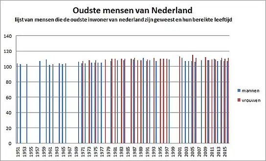 De ontwikkeling van de leeftijd van de oudste mannen en vrouwen van Nederland uit de tabel hierboven is te zien in de figuur hieronder. De figuur geeft, voor elk jaar waarin een oudste Nederlander is overleden, de leeftijd van die Nederlander. Op deze manier is te zien hoe de maximumleeftijd van de oudste Nederlander zich ontwikkelt. Er zijn jaren waarin er geen oudste mannelijke of vrouwelijke Nederlander is overleden, maar alleen jongere personen dan de op dat moment oudste Nederlander; die jaren zijn in de grafiek blanco gelaten.