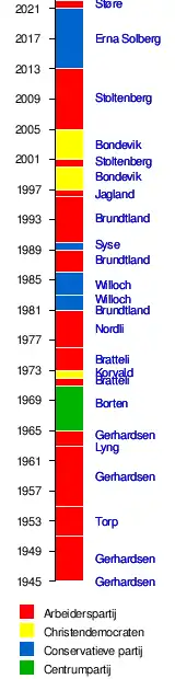 | (Jaren zijn verkiezingsjaren; De kleur geeft de partij aan die de premier heeft geleverd.) |
