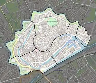 De buurten in de binnenstad van Middelburg. Om het centrum met de klok mee: Stadhuis, Abdij, Damplein en Markt. In het oosten: Dampoort