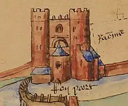 | (oude) Witte Poort of Haagpoort | Westelijk einde van het Noordeinde | 52° 9′ 36″ NB, 4° 28′ 53″ OL | ca. 1419 | 1650 | ![]() |