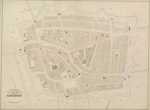 (1) Morspoort - (2) Rijnsburgerpoort - (3) Marepoort - (4) Herenpoort - (5) Zijlpoort - (6) Hogewoerdsbinnenpoort - (7) Hogewoerdsbuitenpoort - (8) Koepoort - (9) Witte Poort (binnenpoort) - (10) Witte Poort (buitenpoort) - (A) Noortpoort/Haagpoort - (B) Suytpoort/Oostpoort - (C) Lopsenpoort, later Blauwpoort - (D) Oude Zijlpoort - (E) Costverlorenpoort/Oude Hogewoerdspoort, later Oude Hogewoerdsbinnenpoort - (F) Sint-Jorispoort - (G) Oude Hogewoerdsbuitenpoort
