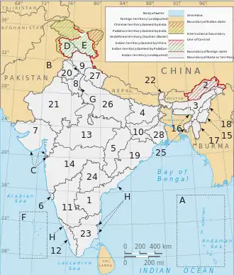 - ↑ Dit betreft het gehele door India geclaimde gebied, dus inclusief het door Pakistan en China bestuurde deel van Jammu en Kasjmir. Alleen het door India bestuurde deel heeft een oppervlakte van ongeveer 42.241 km².