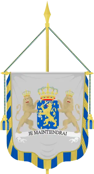De vlag van Flevoland; met op de broektop een witte lelie geplaatst