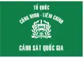 1955 - 1975 | Vlag van de Nationale Politie van de Republiek Vietnam | Een groene vlag met het motto "Tổ quốc, Công minh - Liêm chính" (Vaderland, Gerechtigheid - Integriteit) bovenaan, het politieembleem in het midden en de naam "Cảnh sát Quốc gia" (Nationale Politie) onderaan. |