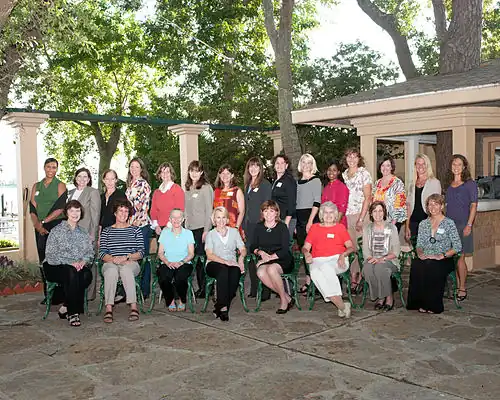 Staand (vanaf links): Jeanette Epps, Mary Ellen Weber, Marsha Ivins, Tracy Caldwell Dyson, Bonnie Dunbar, Tammy Jernigan, Cady Coleman