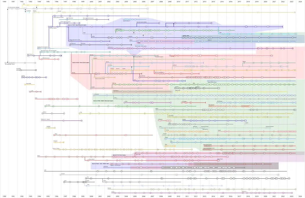 | Mozilla Suite | Gecko | Windows, Mac OS X en Linux | Voortgezet als SeaMonkey. | Inactief |
