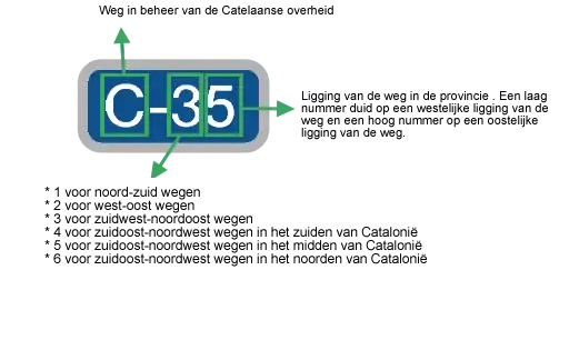- De letter C voor het koppelteken (bijvoorbeeld, C-31) betekent dat de weg onder beheer van de Catelaanse overheid staat.