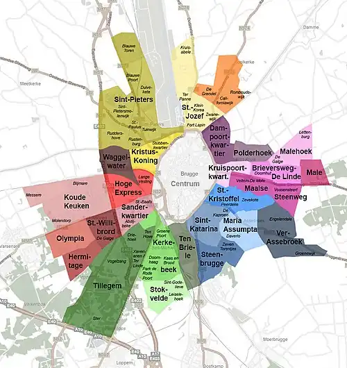 - ↑ Kaart van de Brugse binnenstad met opdeling in kwartieren en wijken, brugge.be