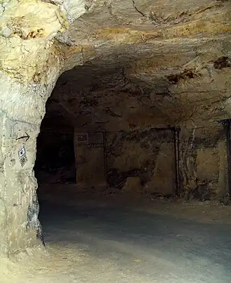 - ↑ Mogelijk hangt dit samen met de invloed van het Frans in Zuid-Limburg, met name in Maastricht. Het Franse woord grotte had in het verleden betrekking op zowel natuurlijk ontstane grotten als door mensen gemaakte groeven. Het Italiaanse grotta heeft nog steeds die dubbele betekenis.