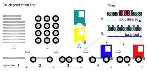 In het voorbeeld van een productie van trekkers op de lopende band (zie figuur) worden verschillende soorten trekkers geproduceerd. Horizontaal zijn vijf productiestandplaatsen getekend. Verticaal daarop de aanvoerlijnen voor de hoofdlijn. In het voorbeeld worden 6x4- en 4x2-trekkers geproduceerd. De 6x4-trekker heeft, in tegenstelling tot de 4x2-trekker, een extra aangedreven as. Deze extra as verstoort de productiebalans, omdat het meer tijd kost om deze te assembleren. Als in de productievolgorde zoals in A afgebeeld er te veel 6x4-trekkers achter elkaar komen, dan betekent dit extra werk in de productieplaats 2, waar de assen gemonteerd worden. Wordt daarentegen zo veel mogelijk een 4x2-trekker na een 6x4-trekker gemaakt dat ontstaat er een uitgebalanceerde lijn B. Een andere mogelijkheid om de productielijn te balanceren is om een extra productiestandplaats voor het monteren van de extra as toe te voegen. De onbalans van de productie blijft dan beperkt tot die ene productiestandplaats. In de praktijk, omwille van de vele mogelijke varianten, is het uitbalanceren van de productielijn een complex proces.
