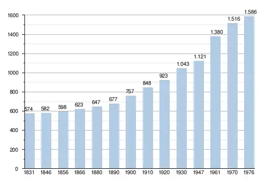 - Bronnen:NIS, Opm:1831 tot en met 1970=volkstellingen; 1976 = inwoneraantal op 31 december