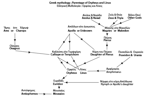 Op de berg van de muzen, de Helicon, had Linus, zoon van Amphimarus (of Apollo) en de muze Urania, een grot met zijn beeld, waar hem jaarlijks voor het offer aan de muzen een lijkoffer werd gebracht. Hij zou zich met Apollo in een wedstrijd hebben gewaagd en daarom door deze zijn gedood. Van een bekwaam zanger werd hij allengs een wijze en geleerde. Hij zou Hercules in het citherspel hebben onderwezen. Doch toen hij de onleerzame leerling eens bestrafte, werd hij door hem met de cither gedood. In het Alexandrijnse tijdvak maakte men hem ook tot een onzekere schrijver, evenals Orpheus, Musaeus en anderen, met welke hij in betrekking van bloedverwantschap werd gebracht.