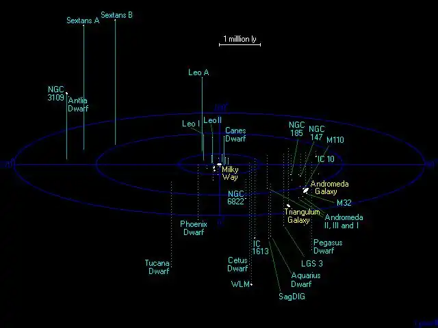 dSph | Toekan | 0,870 | Lv 7 = 0,06 | 323 | -47 | geïsoleerd, aan de andere kant van de Melkweg en aan de rand van Lokale Groep, na SagDIG het verste weg van het zwaartepunt van de Lokale Groep |