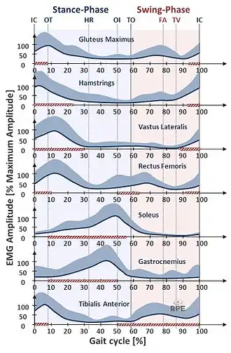 Verschillende spieren spelen een rol bij het lopen die varieert van hielcontact (HS), zoolcontact (FF), middenstandfase (MS), hiel los (HO), teen los (TO), midzwaaifase (MSW) tot weer hielcontact.