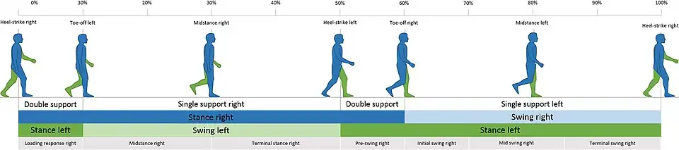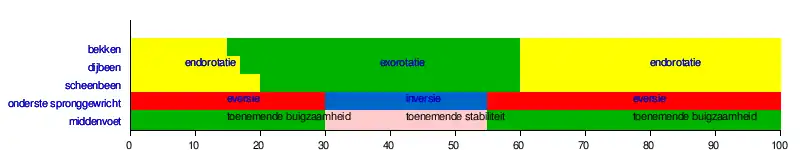 - hielcontact (heel-strike) of eerste voetcontact (initial contact) op 0%. Hierbij staat de voet naar boven gebogen, in dorsiflexie. Daardoor raakt de rest van de voet de grond nog niet
