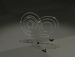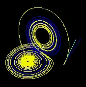Deze figuren — gebaseerd op de waarden ρ = 28, σ = 10 en β = 8/3 — laten 3 tijdsegmenten zien van de 3-D evolutie van 2 trajecten (blauw en geel) in de Lorenz-aantrekker. De beginpunten van deze trajecten hebben slechts een verschil van 10−5 in de x-coördinaat. Aanvankelijk lijken de twee trajecten samen te vallen (alleen het gele traject is te zien doordat dit over het blauwe heen wordt getrokken), maar na enige tijd lopen ze duidelijk uiteen. Weergave in Java van de continue evolutie van de Lorenz-aantrekker.
