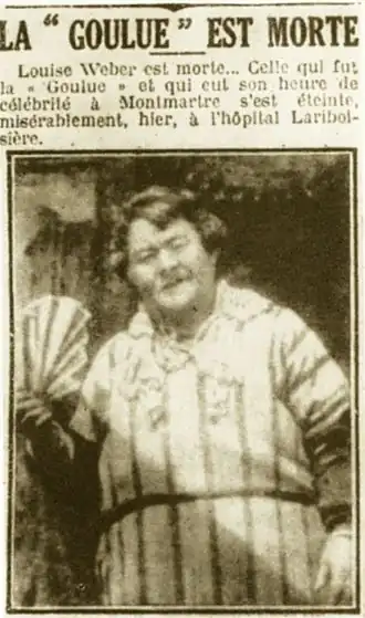 - ↑ a b c d e f g h i j k l m (fr) La Goulue, Biographie Deze bron noemt ten aanzien van haar optreden in 1925 dat, naast Jean Cocteau, ook Raymond Radiguet in het publiek zou hebben gezeten. Die was echter al in 1923 overleden. Gearchiveerd op 30 juni 2023.