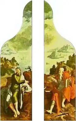 | Twee wapendragers (voormalige buitenzijde van het vorige drieluik) | 1531 | olieverf op doek (overgebracht van paneel) | elk luik: 89 x 33,5 | Sint-Petersburg, Hermitage | ГЭ-407 | 211b | |
