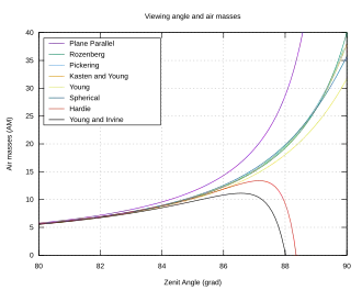 Er bestaan verschillende benaderingen om de luchtmassa bij grote zenithoek (kleine hoogte) te berekenen. Hierbij wordt rekening gehouden met de kromming van de Aarde.
