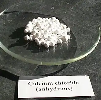 De calciumchloride reageert met water en waterdamp uit de te drogen omgeving. Er blijft een pekel achter: CaCl2 + 2 H2O → CaCl2·2H2O