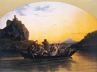 Veel van Richters werk toont een romantisch terugverlangen naar een tijd en samenleving die tijdens zijn leven feitelijk al voorbij was. Typerend voorbeeld is Überfahrt am Schreckenstein (1837, Pont op de Elbe bij Schreckenstein). In een tijd die gekenmerkt werd door opkomende industrialisatie en urbanisatie, waarin gemeenschapszin steeds meer onder druk kwam te staan, schildert Richter een stil en idyllisch tafereel, een vredig samengaan van mensen van diverse pluimages en leeftijden, met een sterke nadruk op de intimiteit in de relatie van een bruidspaar. Het is een soort terugverlangen naar een tijd die voorgoed voorbij leek, niet gespeend van enig patriottisme, hetgeen goed weerklank vond bij het Duitse publiek. Tegelijkertijd kan het werk gezien worden als een soort symbool voor 'de reis des levens': niemand kon zeker zijn dat hij uiteindelijk veilig aan de overkant kwam. De harpspeler kan daarbij worden beschouwd als een bijna mythische figuur, zoals die bijvoorbeeld ook in Goethes Wilhelm Meisters Wanderjahre voorkomt: een wijze bard van het leven.