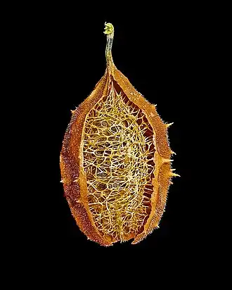 De vruchtstelen zijn 7 tot 20 mm lang. De vrucht is 6 tot 10 cm lang en 3 tot 5 cm breed. Ze hebben stekels aan de buitenkant en aan de binnenkant een fijn netwerk van vezels. De zaden zijn bijna zwart, glad en afgeplat en 7,5 tot 10 mm lang.