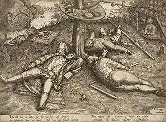 Een boer, een krijgsman en een klerk liggen broederlijk onder een boom als spaken rond een wielnaaf. Aan de stam is een scheef tafelblad bevestigd met aangevreten en omgevallen lekkernijen. De radiale compositie geeft een indruk van rotatie. De boer slaapt op zijn dorsvlegel en de soldaat op een kussen, met zijn lans en ijzeren handschoen bij de voeten. De geleerde, ruggelings op zijn zachte pelsmantel en met een dichtgegespt boek naast zich, ligt met open ogen te wachten tot het lekkers uit de wijnkruik hem in de mond druppelt.