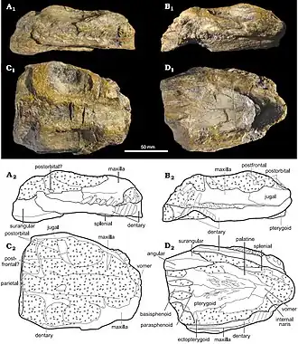 Daarnaast is er een unieke combinatie van op zich niet unieke kenmerken. Het jukbeen raakt de rand van de oogkas. Door de achterste holten tussen de pterygoïden is een opvallende beennaad zichtbaar tussen het parasfenoïde en het basisfenoïde. De onderzijde van het parabasisfenoïde (verbonden parasfenoïde en basisfenoïde) draagt geen kiel waarbij de voorzijde van de onderkant plat is en de achterzijde zwak bol. Een voorste holte tussen de pterygoïden ontbreekt. De onderzijden van de pterygöide hebben evenwijdige richels op het verhemelte.