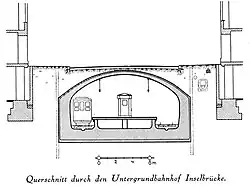 Terwijl de ondergrondse stations van de Berlijnse metro tot dan toe rechtstreeks naar de straat leidende uitgangen hadden gekregen, werd in station Inselbrücke aan beide uiteinden van het eilandperron een kleine tussenverdieping aangelegd. De diepe ligging gaf ook de mogelijkheid een ruime hal te creëren, met een als tongewelf uitgevoerd dak. Hierdoor waren steunpilaren voor het eerst in geschiedenis van metro van Berlijn overbodig. Architect Alfred Grenander, die verantwoordelijk was voor alle Berlijnse metrostations uit deze periode, maakte net als hij eerder op de Spittelmarktlijn had gedaan gebruik van een herkenningskleur, in het geval van station Inselbrücke groen. Deze kleur werd toegepast in de omlijstingen van de reclame- en stationsnaamborden en op de kiosken op het perron. Voor de rest werd het station volledig bekleed met witte tegels.