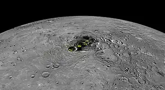 - In 2012 bevestigde MESSENGER de twintig jaar oude veronderstelling dat water in de poolkraters aanwezig is. De betreffende kraters liggen continu in de schaduw. Waterijs bevindt zich aan de oppervlakte of enige decimeters onder het oppervlak.[27][32] Het grootste deel van het ijs is bedekt door een donkere laag. Dit vormt een sterke aanwijzing, dat het water van kometen en planetoïden afkomstig is.[33] De exacte samenstelling ervan is nog onbekend. Betreft het zuiver waterijs, of is het met andere materialen vermengd? De in 2018 gelanceerde sonde BepiColombo[34], die volgens planning in november 2026[35] bij Mercurius aankomt, moet hier aanvullend onderzoek naar verrichten.[36]